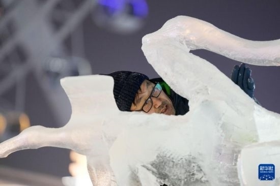1月2日,在冰雪大世界園區(qū)內(nèi),參賽選手在進(jìn)行冰雕創(chuàng)作。