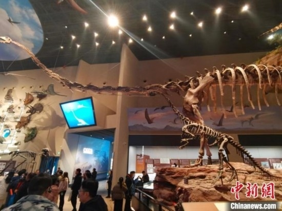 1月3日,中國古動(dòng)物館(保定自然博物館)展出的擁有世界上最長脖子的中加馬門溪龍化石骨架。呂子豪 攝