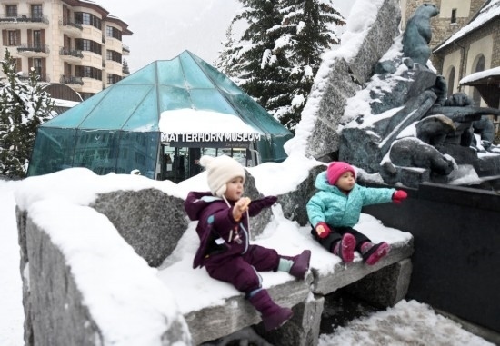 2023年12月9日,兩名兒童在瑞士采爾馬特的馬特洪峰博物館前玩耍。新華社記者 連漪 攝