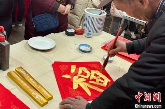 2月10日,大年初一,北京廠甸廟會(huì)開(kāi)門迎客。圖為書(shū)法家為市民和游客寫福、送福。中新社記者 徐婧 攝