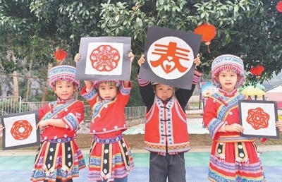 湖南省永州市江永縣蘭溪瑤族鄉(xiāng)的孩子們展示剪紙作品,用指尖上的技藝迎接新春佳節(jié)的到來(lái)。田如瑞攝(人民視覺(jué))