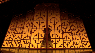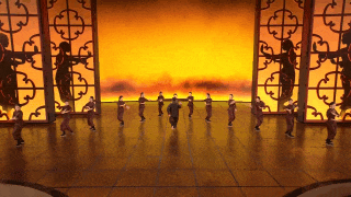 《詠春》來(lái)自舞劇《詠春》選段,已經(jīng)上演了百場(chǎng),但在春晚是個(gè)特別的版本。為了創(chuàng)造出更加意蘊(yùn)豐富的想象空間,總臺(tái)臺(tái)長(zhǎng)慎海雄在推薦這個(gè)舞劇片段時(shí),提出了幾個(gè)建議,包括演員服裝從黑色的香云紗改為絳紅色,男女主角之間的關(guān)系要從男主角一一過招“大敗”女主角改為相互切磋武藝,開場(chǎng)以男主角的武術(shù)剪影來(lái)增強(qiáng)吸引力,通過使用剪影效果來(lái)展現(xiàn)“葉問”的出場(chǎng)。當(dāng)燈光亮起,窗欞上“詠春拳”三個(gè)書法大字淡去,“葉問”的剪影如同舞動(dòng)的水墨畫一般,隨即演員閃身舞出屏風(fēng),影子與真身共舞。由虛入實(shí),由平面到立體,“剪影”的設(shè)計(jì)讓短短半分鐘的獨(dú)舞大大增加了層次感和觀賞性,為空曠的舞臺(tái)創(chuàng)造出一個(gè)“頂天立地”的葉問之影,視覺震撼瞬間放大,堪稱畫龍點(diǎn)睛之筆。