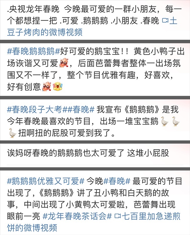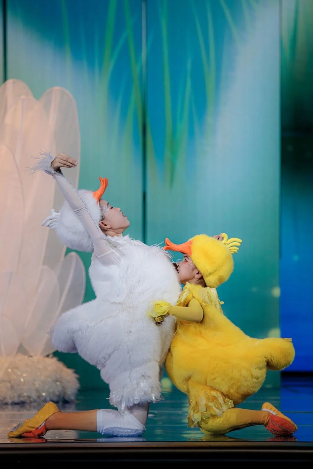 當(dāng)你提“鵝鵝鵝”,自然要期待“曲項(xiàng)向天歌”。駱賓王、唐詩(shī)宋詞、中華文化....看到節(jié)目單上的題目《鵝鵝鵝》,大概很多觀眾都以為是要詠詩(shī)。當(dāng)大幕開啟,柴可夫斯基的《天鵝湖》奏起,氣氛瞬間變得端莊典雅了,可接下來(lái)出場(chǎng)的是一群圓滾滾、扭著屁股的小小鵝,這波反差萌,讓網(wǎng)友直呼“創(chuàng)意絕了”。