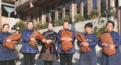 非物質(zhì)文化遺產(chǎn)傳承、文化產(chǎn)品開(kāi)發(fā),使鄉(xiāng)村文化在鄉(xiāng)村振興建設(shè)中發(fā)揮更大作用,也讓鄉(xiāng)村文化遺產(chǎn)更好地留存下來(lái)、傳承下去。非遺傳承人楊成蘭(左三)與織娘一起展示手作侗布。受訪(fǎng)者供圖本文圖片除署名外均由朱玉芳攝