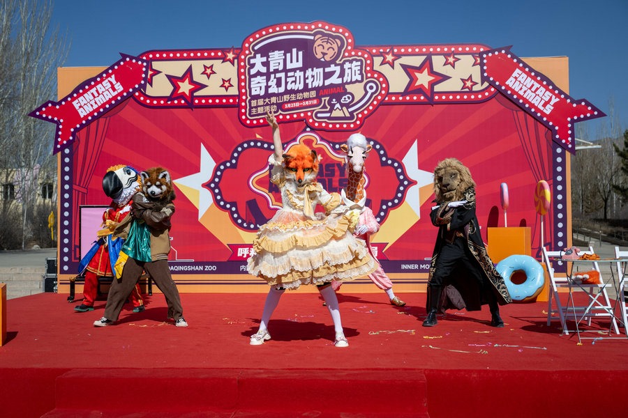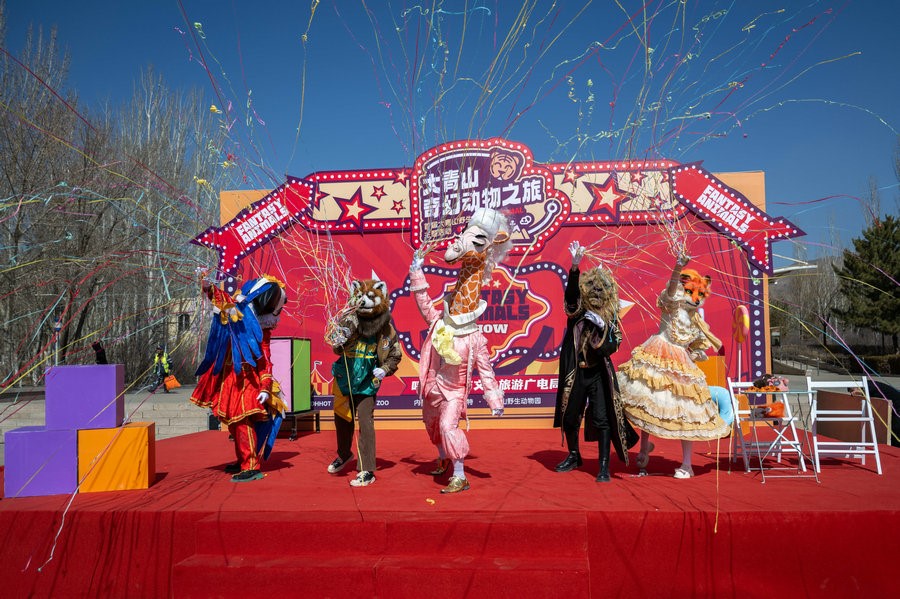 3月22日上午,在內蒙古呼和浩特大青山野生動物園里,5只動物人偶正在為23日舉行的國內大型動物主題互動巡游偶劇《奇幻動物城》彩排。