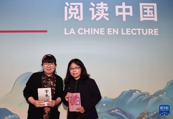4月14日,在法國(guó)巴黎舉行的2024巴黎書展上,中國(guó)作家喬葉(左)、葉彌分別攜其作品《寶水》《不老》亮相書展。