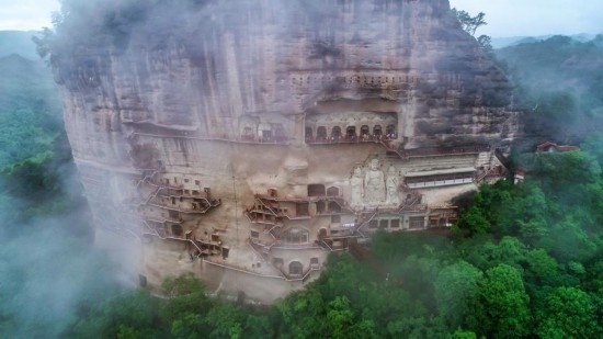 這是2023年5月31日在甘肅省天水市拍攝的煙雨籠罩下的麥積山石窟(無人機(jī)照片)。新華社記者 郎兵兵 攝