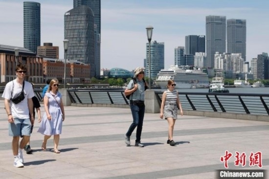 6月2日,外國(guó)游客在上海外灘濱江步道游覽。 中新社記者 殷立勤 攝