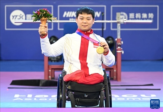 圖為2023年10月24日,中國選手齊勇凱在杭州第4屆亞殘運(yùn)會舉重項(xiàng)目男子59公斤級頒獎儀式上。新華社記者 貝赫 攝