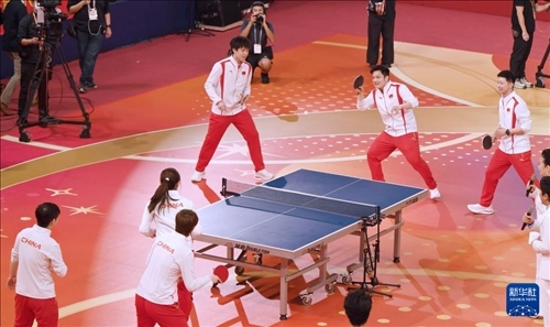 8月30日,乒乓球隊(duì)六位冠軍選手進(jìn)行乒乓球表演。
