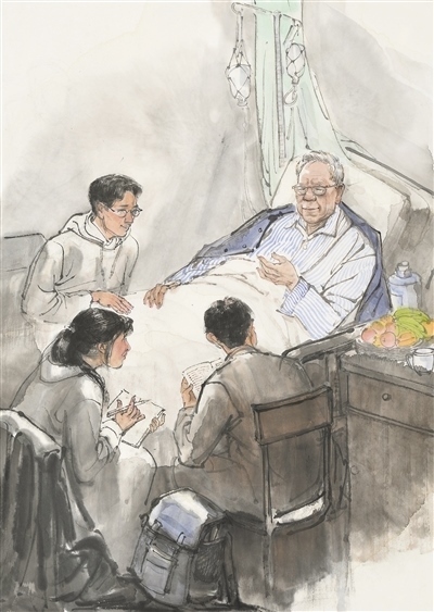 人民教師勤學(xué)篤行、求是創(chuàng)新的躬耕態(tài)度,給無數(shù)人以榜樣的力量,也給美術(shù)創(chuàng)作以靈感。“人民教育家”國家榮譽(yù)稱號獲得者衛(wèi)興華,終其一生都奮斗在勤學(xué)求真的道路上。90余歲時(shí),即使病痛纏身,他仍堅(jiān)持每天學(xué)習(xí)、工作。有感于衛(wèi)興華教授的敬業(yè)精神,高毅特意描繪了臥病在床的衛(wèi)興華堅(jiān)持與學(xué)生探討學(xué)術(shù)課題的場景,主人公那專注的神情令人動(dòng)容。像衛(wèi)興華這樣堅(jiān)守耕耘的教師還有許多。劉昌明水彩畫《一個(gè)教師的工作臺》便以細(xì)致的場景描繪表達(dá)出對教師群體的敬意。貼著泛黃舊紙的墻面、藥瓶和墨水瓶之間的教案、脫漆的木桌、一副老花眼鏡……畫家在此調(diào)動(dòng)了一切能夠反映老一輩教育者辛勤伏案的元素,象征著沒有直接出場的教師形象?!按颂師o聲勝有聲”的表達(dá)效果,令人回味無窮。