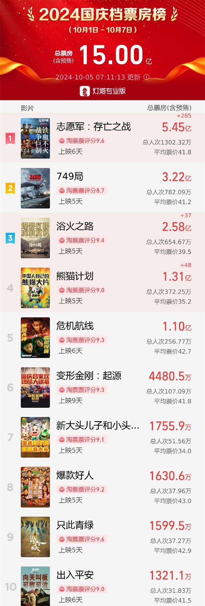 央視網(wǎng)消息:據(jù)網(wǎng)絡(luò)平臺數(shù)據(jù),截至10月5日7時(shí)11分,2024年國慶檔(10月1日—10月7日)檔期內(nèi)總票房(含預(yù)售)突破15億。