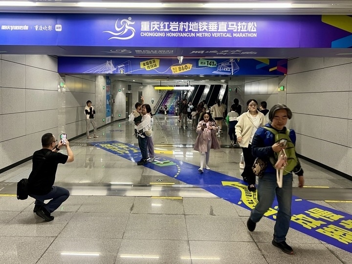 國(guó)慶前夕,這里剛舉辦了一場(chǎng)垂直馬拉松。賽事帶來品牌效應(yīng),前來打卡的人群絡(luò)繹不絕?!按怪瘪R拉松一般在摩天大樓里舉辦,如今地鐵站里居然能跑馬拉松,重慶總是能給游客帶來驚喜。”來自河北的游客張楠說。