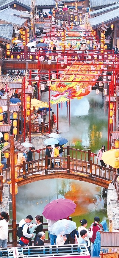 龍門(mén)浩老街上,幾名外地游客沿著青石臺(tái)階漫步至老街最高點(diǎn)——攬?jiān)屡_(tái),遠(yuǎn)眺渝中半島。這條位于重慶市南岸區(qū)南濱路中段的老街,面朝長(zhǎng)江,背依南山,開(kāi)埠文化、巴渝文化等文化底蘊(yùn)深厚。近年來(lái),經(jīng)過(guò)保護(hù)與修繕,這里不僅恢復(fù)了歷史風(fēng)貌,還增添了現(xiàn)代時(shí)尚氣息。古色古香的街道兩旁,新潮的商鋪、餐館和咖啡館為市民游客休閑購(gòu)物提供便利和全新體驗(yàn)?!案惺軙r(shí)光交錯(cuò)的美妙”,成為這里的一大魅力。數(shù)據(jù)顯示,自發(fā)展全域旅游以來(lái),龍門(mén)浩老街所在的龍門(mén)浩街道已接待游客近4000萬(wàn)人次,實(shí)現(xiàn)旅游收入276.8億元,龍門(mén)浩老街還成功創(chuàng)建第二批國(guó)家級(jí)夜間文旅消費(fèi)聚集區(qū)。