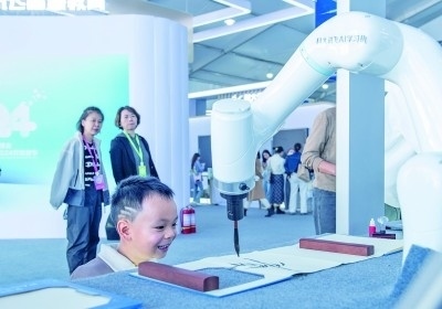 觀眾在參觀第七屆世界聲博會上的一款文藝創(chuàng)作機(jī)器人。新華社記者 傅天攝