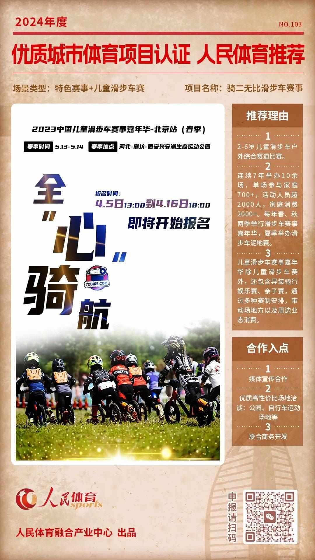 “優(yōu)質(zhì)體育賽事及活動認證推薦計劃”是人民體育“城市體育產(chǎn)業(yè)高質(zhì)量發(fā)展計劃”的重要組成部分,人民體育一直致力于攜手權(quán)威機構(gòu)、組織單位等聯(lián)合推薦優(yōu)質(zhì)項目,項目類型包括且不限于賽事、活動,也涵蓋產(chǎn)品與服務(wù)類別。旨在以更客觀的角度,展示在體育產(chǎn)業(yè)發(fā)展中有所創(chuàng)新,有所價值的項目,促進多方相互了解,融合發(fā)展。