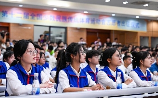 11月4日,第十二屆全國少數(shù)民族傳統(tǒng)體育運(yùn)動會志愿者在出征儀式上。新華社記者 楊冠宇 攝