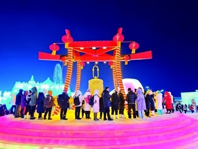 游客在哈爾濱冰雪大世界參加祈?;顒?。