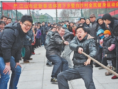 白沙村村民在村全民健身運(yùn)動會上進(jìn)行拔河比賽。