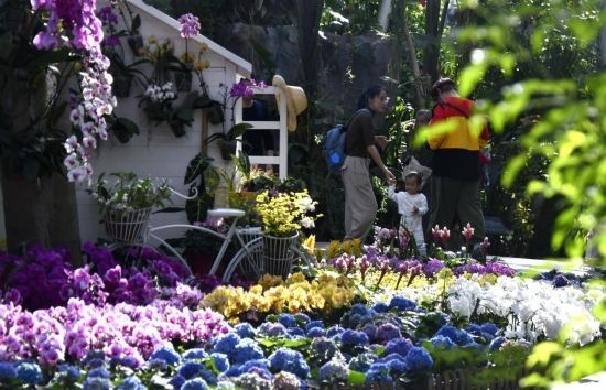 今年春節(jié)假期,在北京世界花卉大觀園,由數(shù)千盆顏色漸變的蝴蝶蘭組成的“花瀑”傾瀉而下、如夢似幻,成為游客爭相合影的景觀。