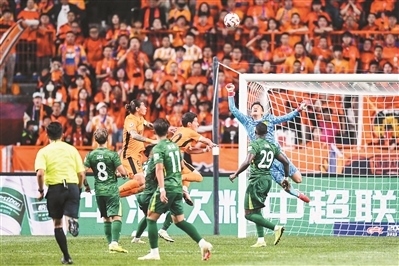 北京國(guó)安隊(duì)門將韓佳奇(上右)在比賽中撲救。