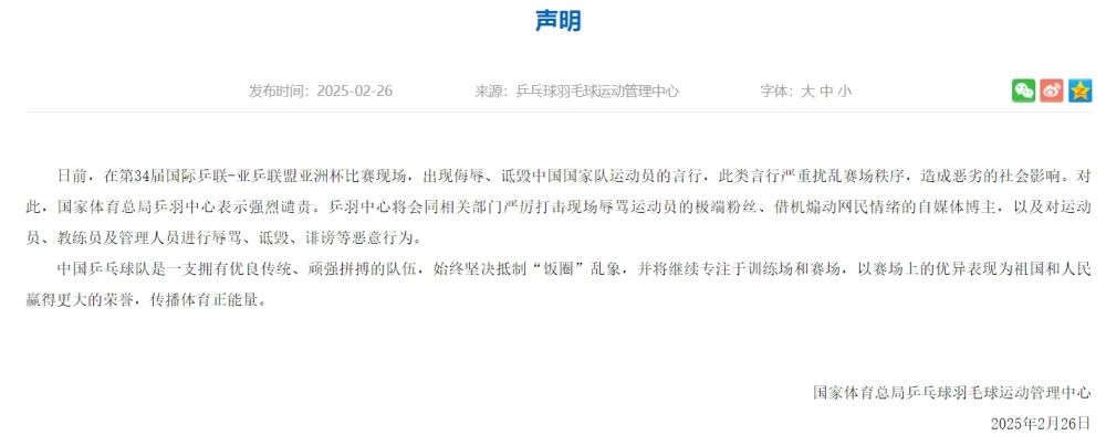 日前,在第34屆國際乒聯(lián)-亞乒聯(lián)盟亞洲杯比賽現(xiàn)場,出現(xiàn)侮辱、詆毀中國國家隊運(yùn)動員的言行,此類言行嚴(yán)重擾亂賽場秩序,造成惡劣的社會影響。