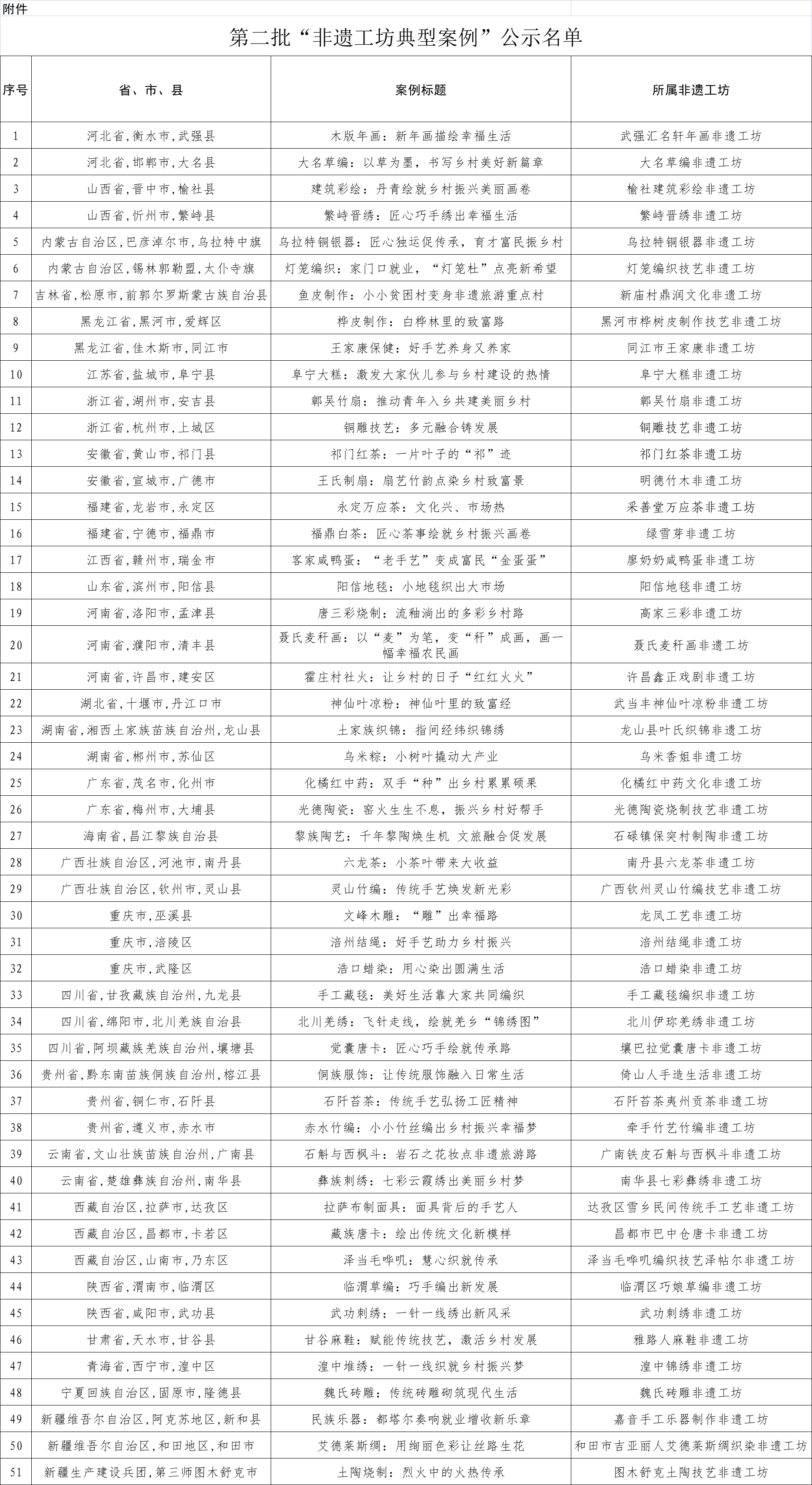 人民網(wǎng)北京3月19日電 (記者楊虞波羅)根據(jù)《文化和旅游部辦公廳 人力資源社會保障部辦公廳 農(nóng)業(yè)農(nóng)村部辦公廳關(guān)于推薦第二批“非遺工坊典型案例”的通知》,經(jīng)各省推薦和專家評議,第二批“非遺工坊典型案例”推薦和遴選工作于日前結(jié)束。現(xiàn)將推薦名單進(jìn)行公示。