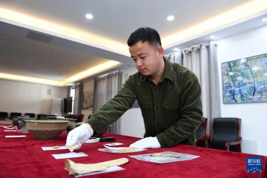 2025年2月25日,在位于陜西省寶雞市的周原田野考古中心,陜西省考古研究院研究實習(xí)員閆永強在整理周原遺址出土文物。新華社記者 李一博 攝
