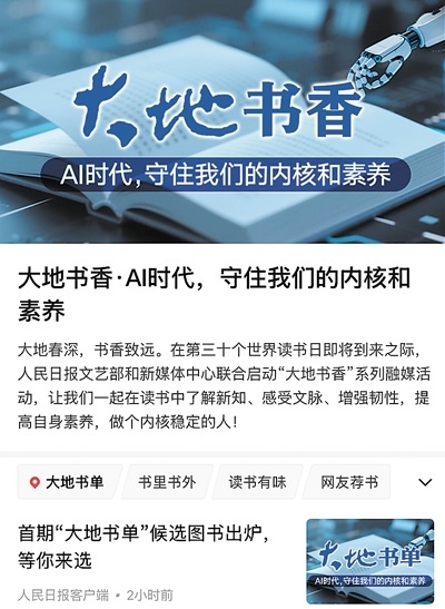 習(xí)近平總書(shū)記在今年全國(guó)兩會(huì)期間的重要講話中指出“書(shū)香是一種氛圍”“數(shù)字閱讀要和傳統(tǒng)閱讀結(jié)合起來(lái),守住我們的內(nèi)核和素養(yǎng)”。在第三十個(gè)世界讀書(shū)日即將到來(lái)之際,人民日?qǐng)?bào)社文藝部和新媒體中心聯(lián)合啟動(dòng)“大地書(shū)香”系列融媒活動(dòng),并圍繞“AI時(shí)代,守住我們的內(nèi)核和素養(yǎng)”推出首期“大地書(shū)單”。來(lái)自出版、文藝、科技、教育等不同領(lǐng)域的20位薦書(shū)人,推薦出35本候選圖書(shū),在人民日?qǐng)?bào)客戶端“大地書(shū)香”專(zhuān)題予以集中呈現(xiàn),參照網(wǎng)友的評(píng)論與推薦,最終推選出10本上榜圖書(shū)。讓我們多讀書(shū)、讀好書(shū),一起在氤氳著書(shū)香的大地上行穩(wěn)致遠(yuǎn)。