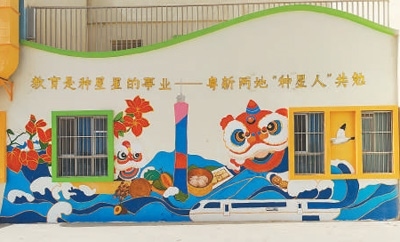 清晨,太陽(yáng)剛剛升起,新疆伽師縣西克爾庫(kù)勒鎮(zhèn)中心幼兒園內(nèi),一群背著畫板、提著顏料箱的年輕人已開(kāi)始忙碌。剛翻新的幼兒園墻面成為他們的畫布,大海與雪山、醒獅與烤馕、廣州塔與喀什高臺(tái)民居等粵新兩地文化元素在此相遇。百人共繪的畫卷(局部見(jiàn)圖),不僅點(diǎn)亮邊疆孩子們的藝術(shù)星空,也滋潤(rùn)著共創(chuàng)者的心靈。