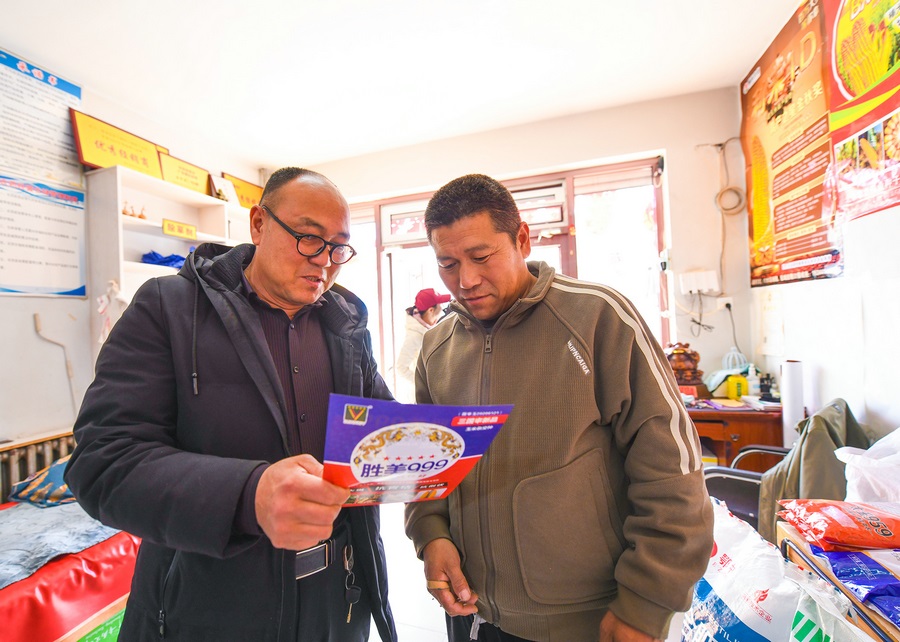 農(nóng)資經(jīng)銷(xiāo)商向種植大戶(hù)介紹種子品種。(攝影:楊鑫)