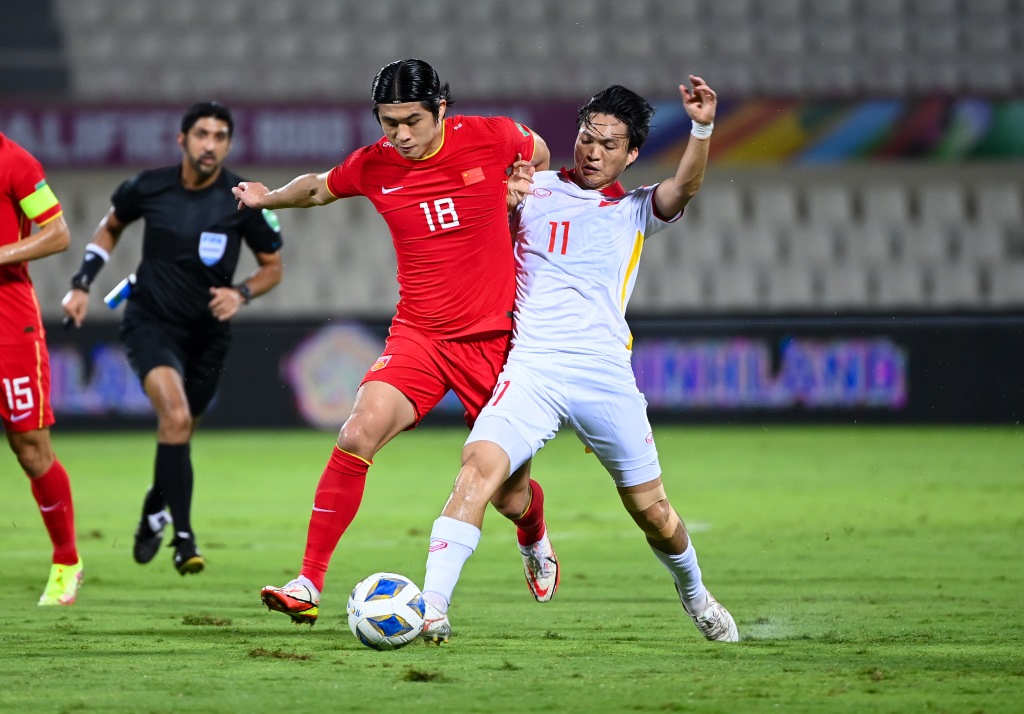輸?shù)羟皟蓤霰荣惡螅袊牨緢霰荣愐巡蝗萦惺?。主教練李鐵在進(jìn)攻端上做出調(diào)整,劉彬彬和張玉寧獲得首發(fā)機會,與艾克森、武磊搭檔鋒線。越南隊則采取“5后衛(wèi)”陣型,通過防守反擊尋找機會。