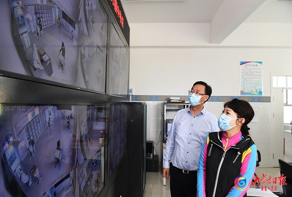6月7日,王莉霞在二連浩特市蒙古族中學(xué)通過視頻監(jiān)控查看學(xué)生高考實(shí)時(shí)畫面,詳細(xì)了解考點(diǎn)疫情防控部署。內(nèi)蒙古日報(bào)社融媒體記者韓卿立攝