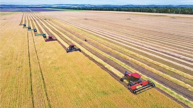 實施鄉(xiāng)村振興戰(zhàn)略,必須把確保重要農(nóng)產(chǎn)品特別是糧食供給作為首要任務(wù),把提高農(nóng)業(yè)綜合生產(chǎn)能力放在更加突出的位置,把“藏糧于地、藏糧于技”真正落實到位。圖為2022年8月17日,大型秋收機械在內(nèi)蒙古呼倫貝爾農(nóng)墾牙克石農(nóng)牧場有限公司第四連(隊)集群割曬作業(yè)。人民圖片王國印/攝