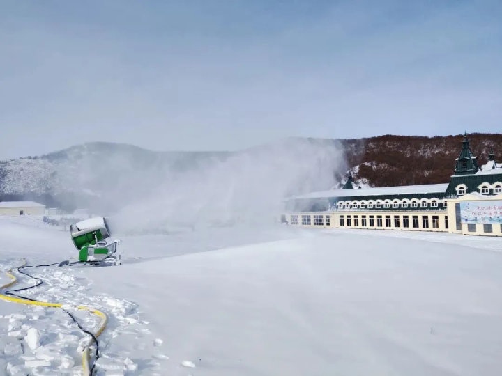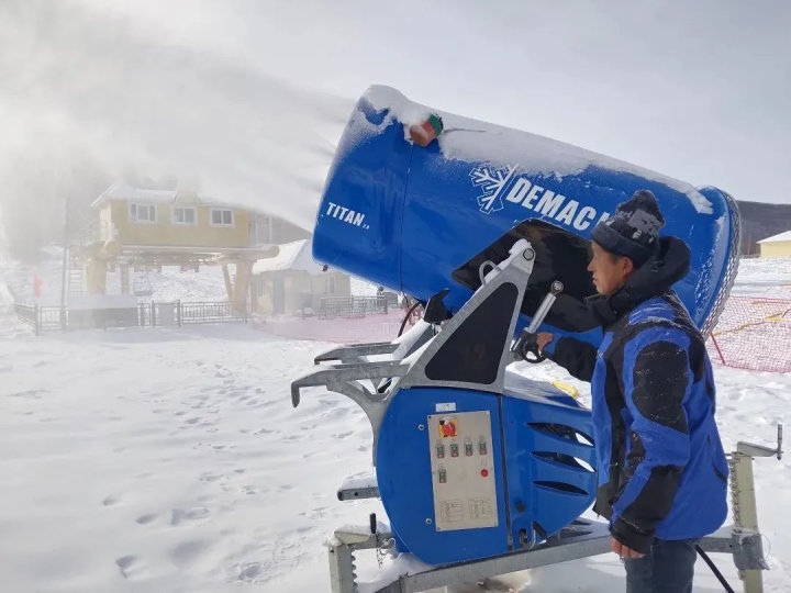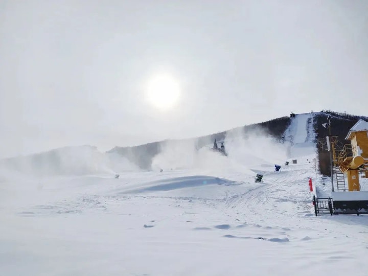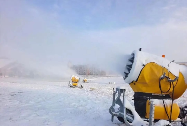 位于赤峰市喀喇沁旗的美林谷滑雪場在11月6日下午3點開機造雪,共布造雪機40臺。從炮筒周圈噴出的水霧,在雪炮扇葉攪動的大風(fēng)加持下立刻凝結(jié)成雪霧和冰霜,被吹到7-8米遠的地上,只過了不到半分鐘,雪炮正前方就凝結(jié)出了一條潔白的雪道。美林谷滑雪場“十四冬”賽道長550米,寬55米,造雪厚度1米,造雪工作將根據(jù)氣候濕度等條件進行相應(yīng)調(diào)整,預(yù)計造雪時間為45至48天,12月中旬將造完40萬平方米雪。