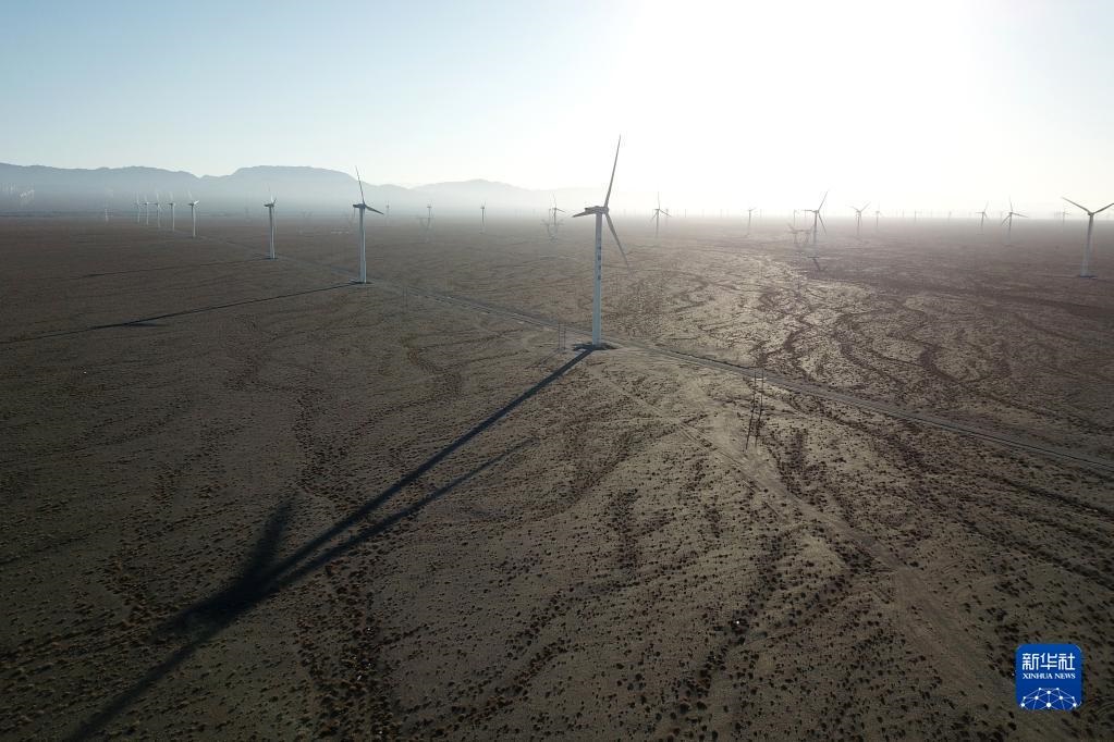 這是2021年12月8日拍攝的中節(jié)能(甘肅)風(fēng)力發(fā)電有限公司玉門昌馬風(fēng)電場的風(fēng)機(無人機照片)。新華社記者 范培珅 攝