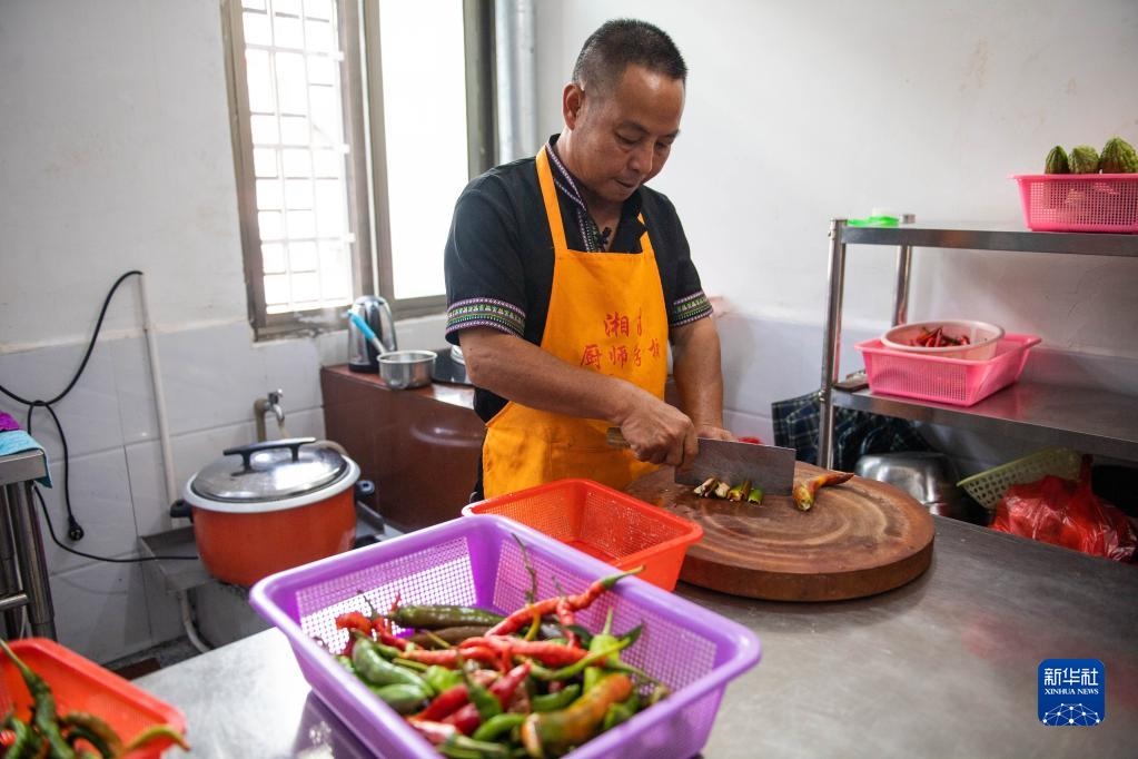 2020年9月17日,在汝城縣沙洲瑤族村,朱小紅在自家開(kāi)的農(nóng)家樂(lè)廚房里切菜。新華社記者 陳思汗 攝
