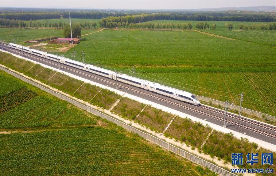 一列“和諧號(hào)”動(dòng)車組列車行駛在內(nèi)蒙古赤峰市元寶山區(qū)的田野間(6月30日攝,無人機(jī)照片)。 當(dāng)日,隨著G8382次“和諧號(hào)”動(dòng)車組列車從內(nèi)蒙古赤峰站緩緩駛出,喀左至赤峰高鐵全線開通運(yùn)營(yíng)。該線經(jīng)喀左站與京沈高鐵接軌,內(nèi)蒙古赤峰地區(qū)由此接入全國(guó)高鐵網(wǎng)。 新華社記者 彭源 攝 -