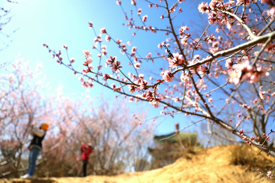 春光明媚,桃花盛開。3月28日,呼和浩特市滿都海公園,一簇簇桃花迎風(fēng)綻放。